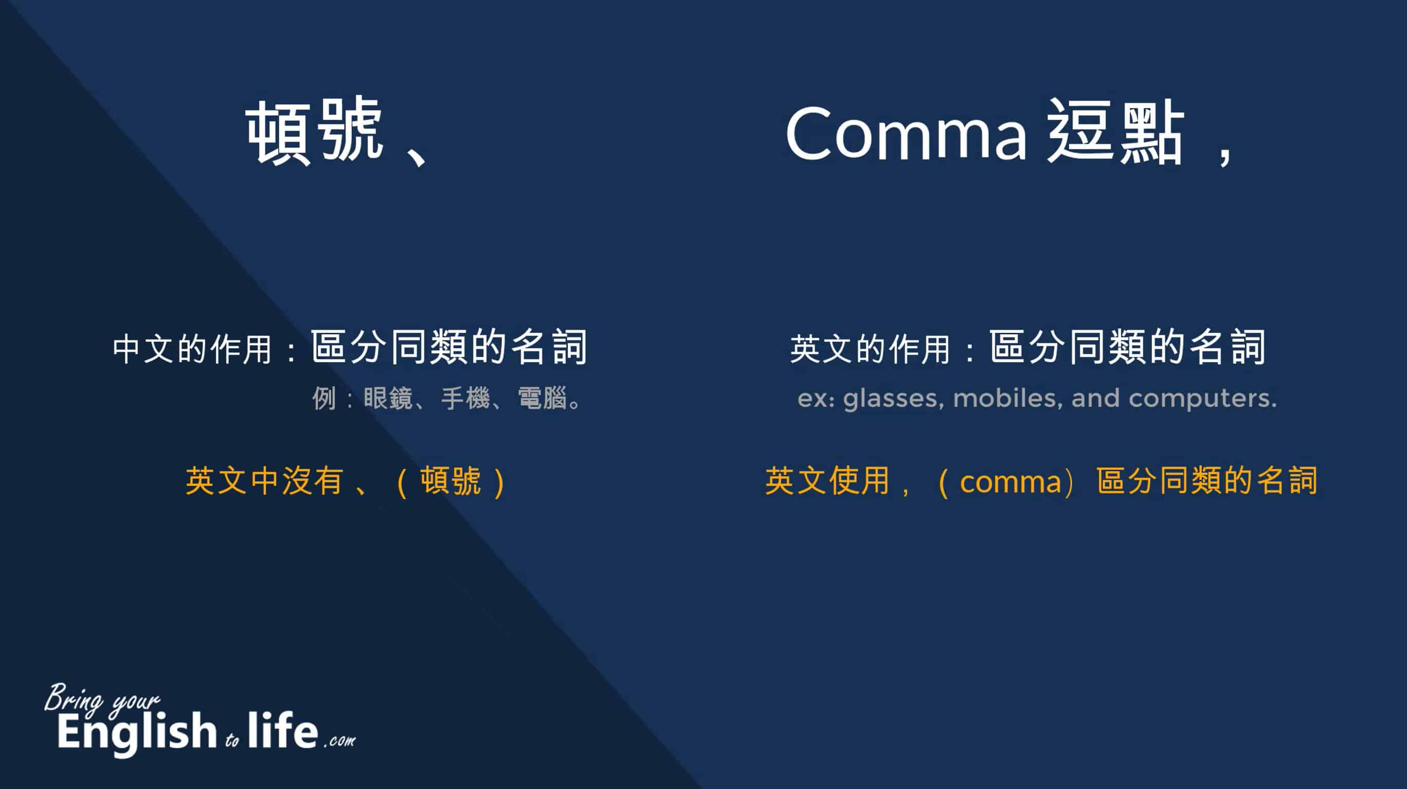 (影片 00:14~) 頓號(、)在中文裡的作用,是區分同類的名詞(例:眼鏡、手機、電腦),不過在英文中,沒有頓號(、)這個標點符號,如果要區分同類的名詞,可以使用逗號(,comma)。