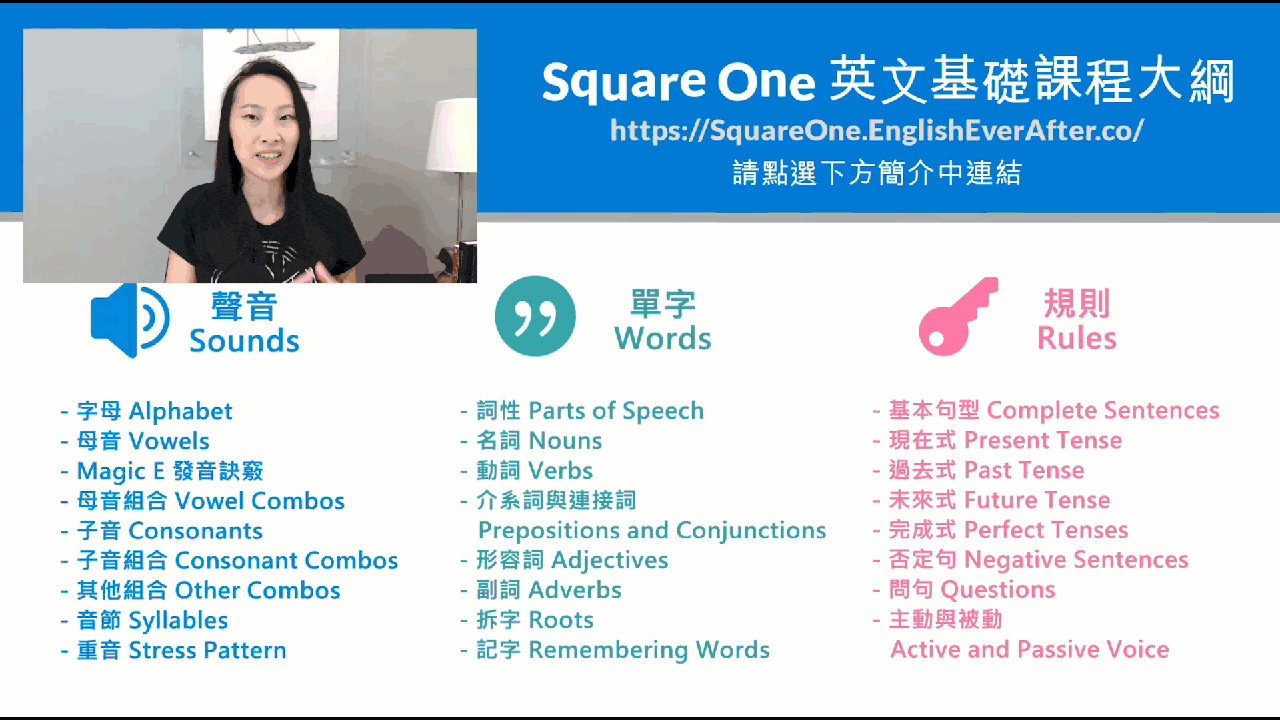 (影片 04:31~) 如果希望穩固英文基礎,歡迎加入由我設計的英文基礎課程 Square One 英文基礎課程從字母 ABC 的發音,到單字的知識,最後進去基本的英文規則文法,三系列課程,建立紮實英文基礎。