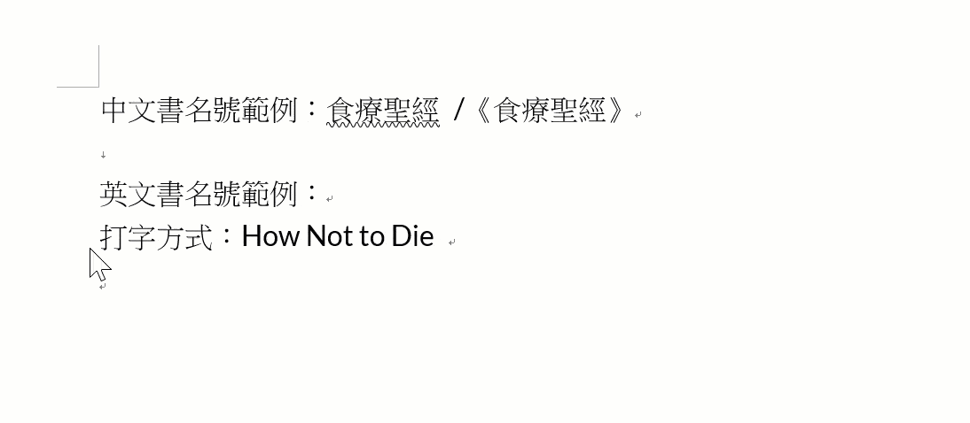 (影片 00:14~) 在中文裡,有多於一種的書名號(如圖示意),但是在英文中沒有書名號的符號,而是利用兩種方式來標示。如果是打字方式,這個書名就要用斜體;而如果是手寫的方式,這個書名下方要加線。