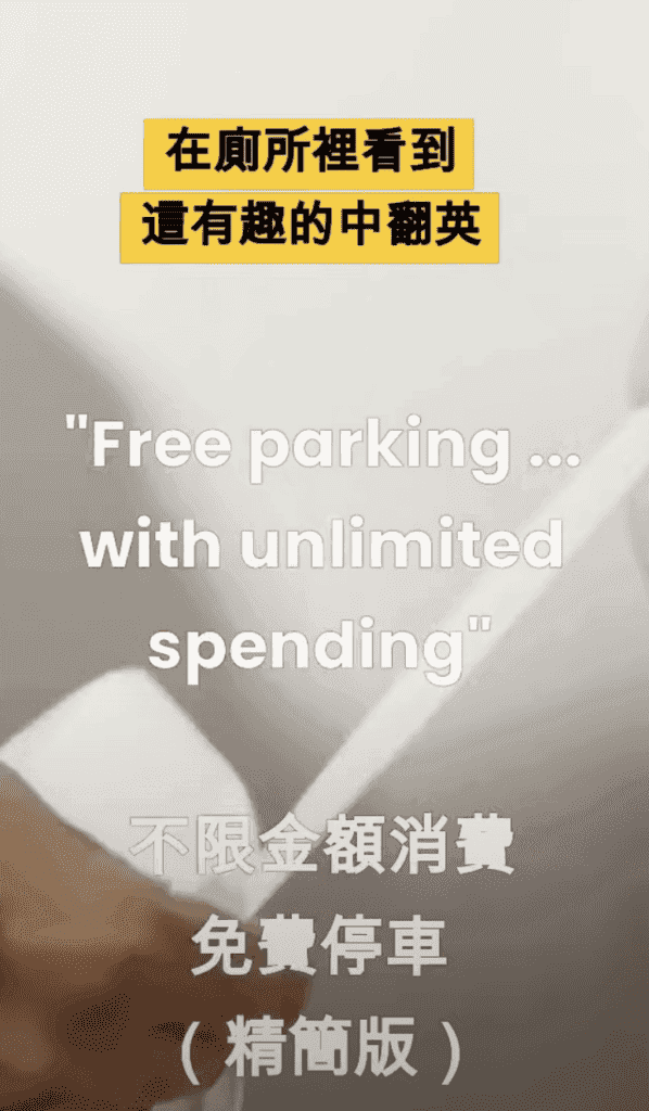 就情況的邏輯判斷來理解,我們知道它要表達「不限金額消費可享免費停車」的英文,但卻因為中翻英的直譯,而讓英文意思變成:「無限消費金和免費停車」。
