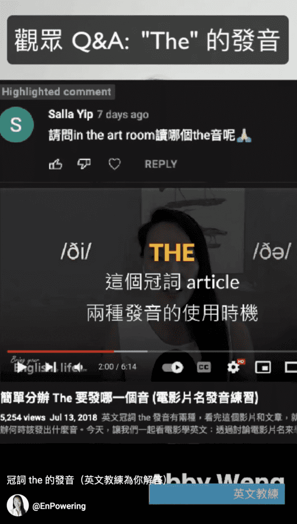 Youtube 觀眾在看完我的影片 「簡單分辦 The 要發哪一個音 (電影片名發音練習)」之後,問了上方的問題。