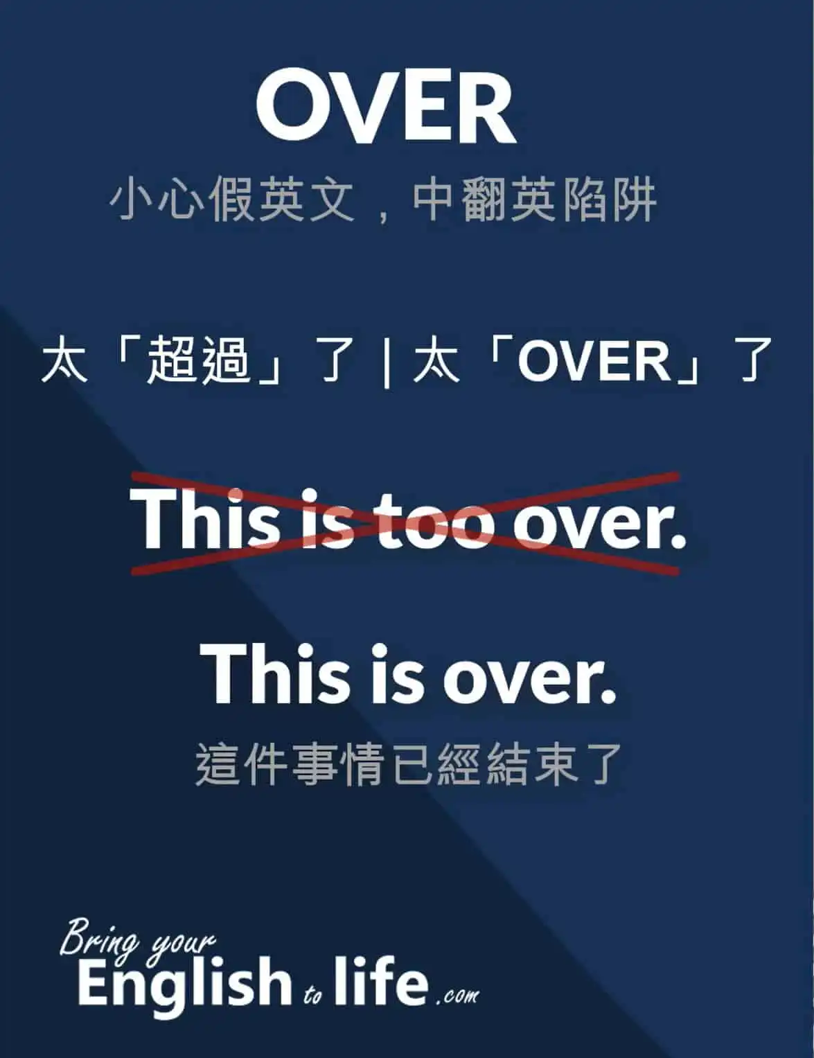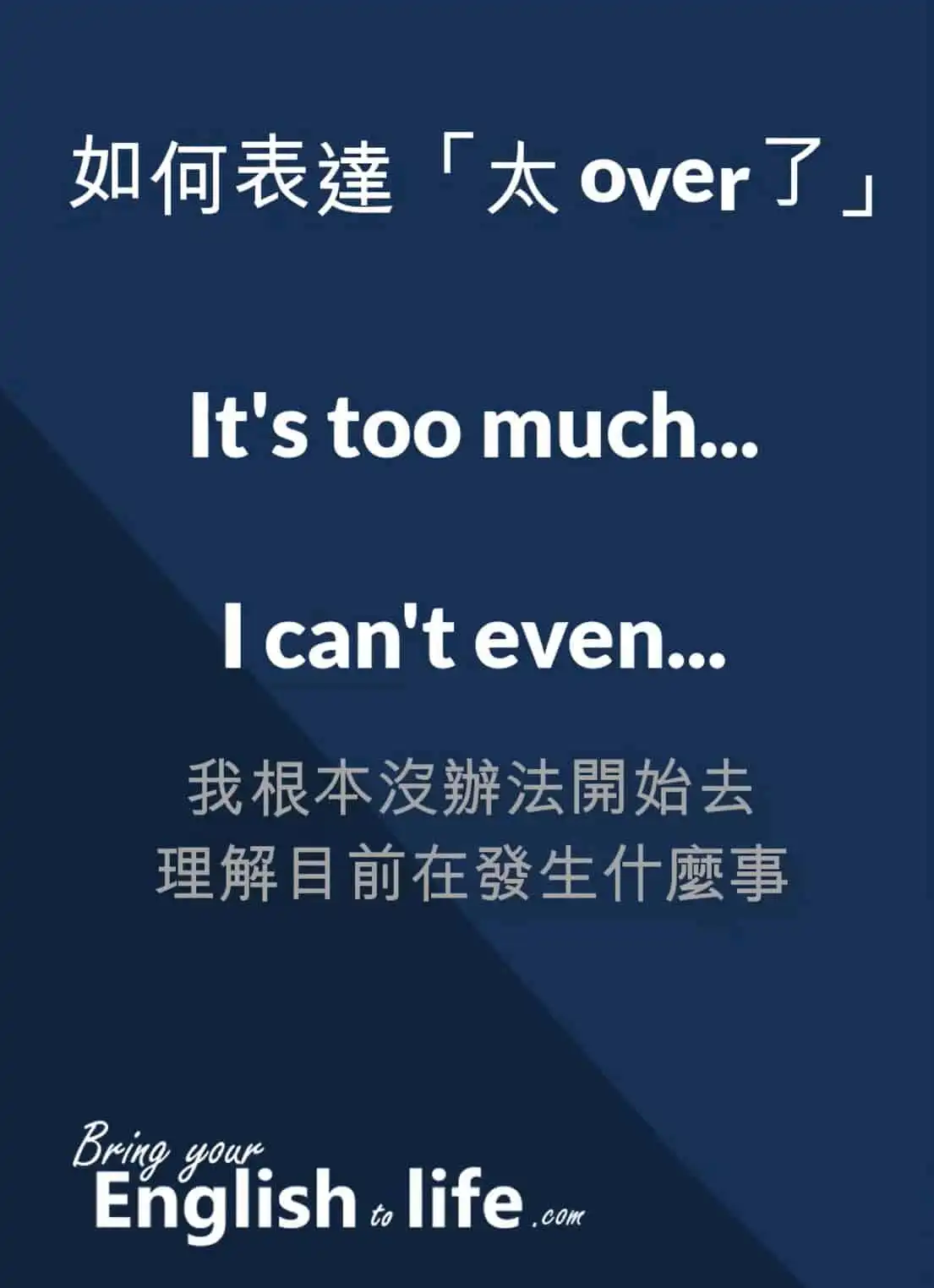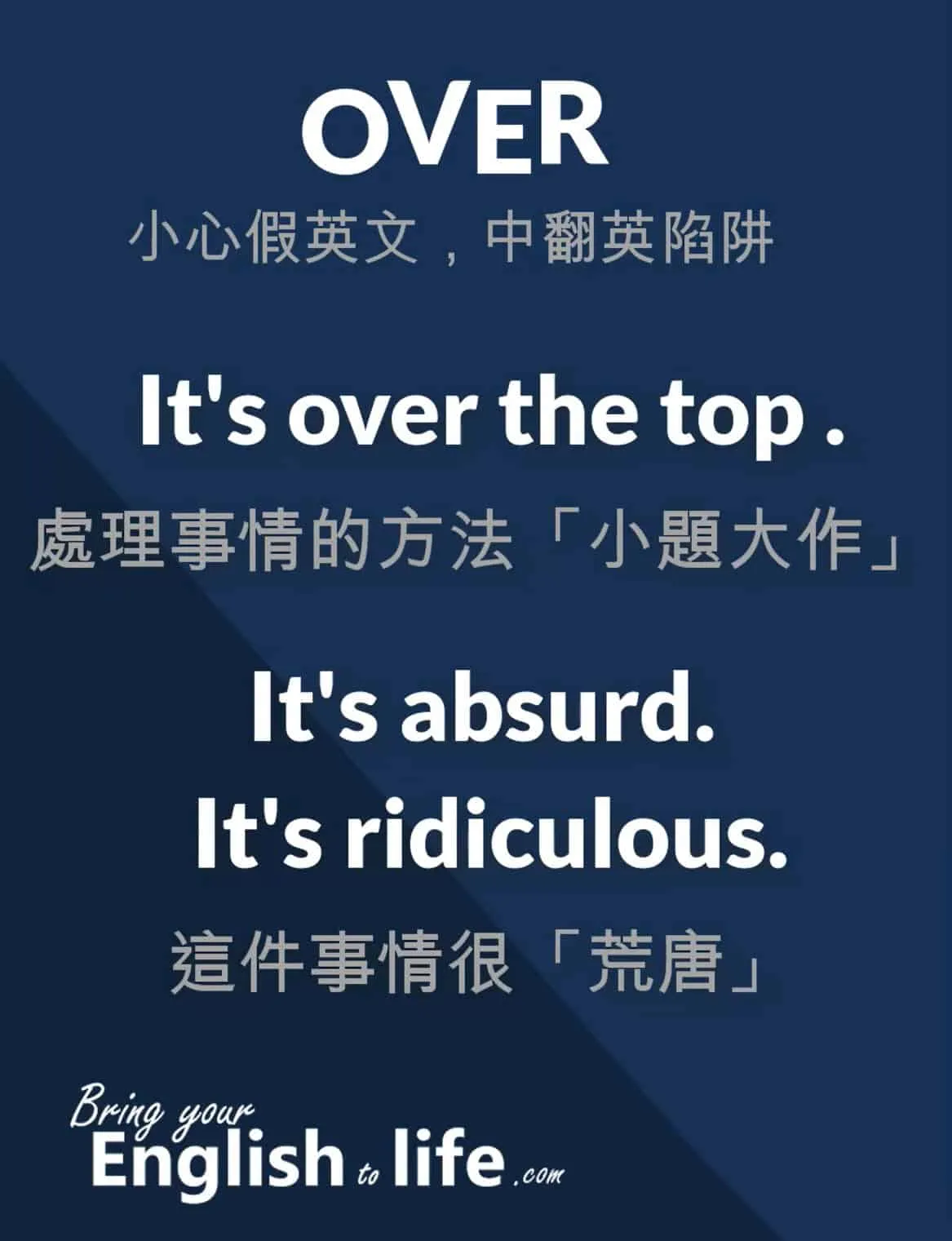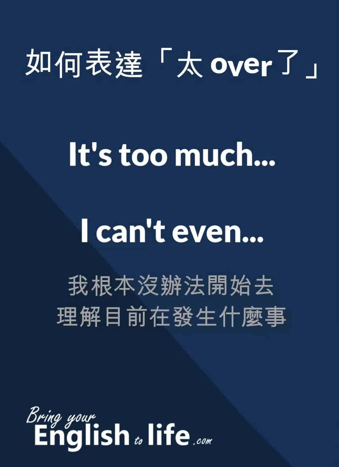 因為太常在日常生活中聽到有人說:「真的太 OVER 了」,今天要特別提醒大家,「太超過」這個中文流行語的英文並不能夠直接翻譯成 “This is too over”。我們要防止這類的「中式英文」在不知不覺之間影響了我們的英文使用。
