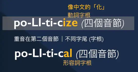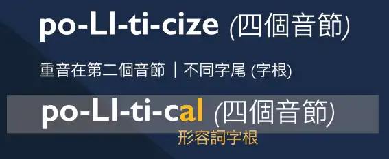 在這裡我們要特別注意到 (影片 00:49~),「政治的」political 這個形容詞,與「政治化」politicize 動詞,雖然音節與重音一樣,但是「字尾」卻不同,一個是 -ize 一個是 -al。
