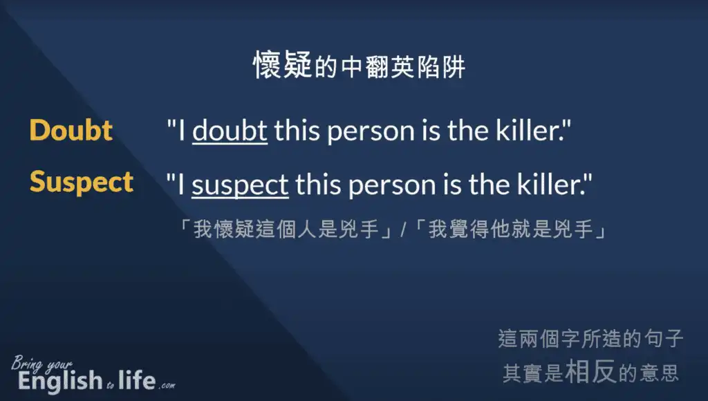 使用 “suspect” (取代 doubt) 在句子中,才能真正的表達「我懷疑這個人是兇手」,也就是「我覺得他就是兇手」。