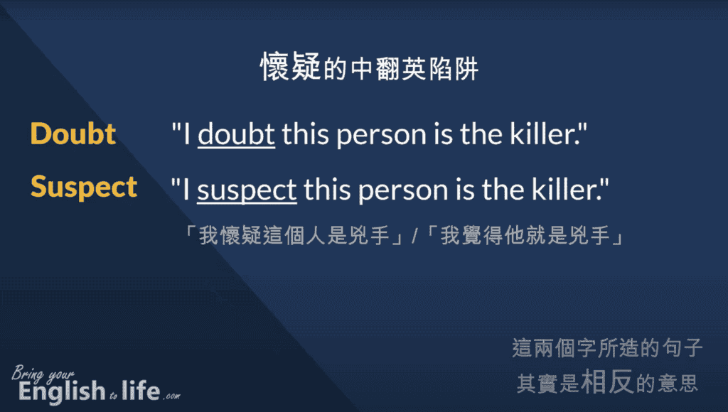 使用 “suspect” (取代 doubt) 在句子中,才能真正的表達「我懷疑這個人是兇手」,也就是「我覺得他就是兇手」。