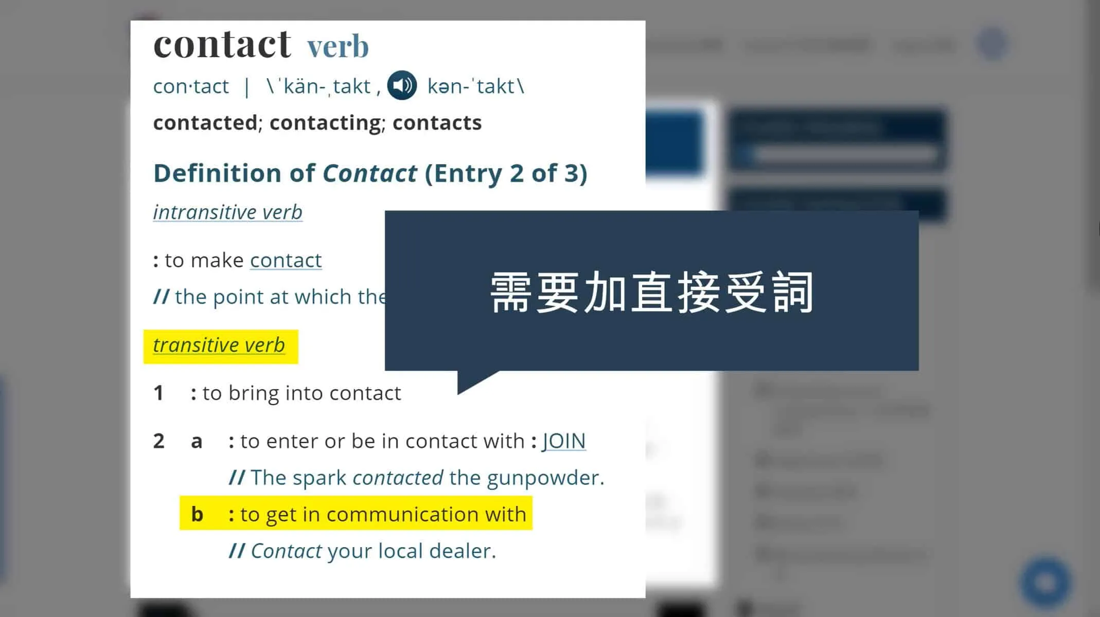 舉例來說,在 Merriam-Webster 線上英英字典中查 contact 這個單字,看到 contact 的三個詞性 (名詞、動詞、形容詞),就今天的例句來查驗聯絡的意思,應該要看動詞的部份,也就是「to get in communication with」這個定義,同時,我們也會看到 transitive verb 這個標示,因此我們知道,不能在中間加介系詞。