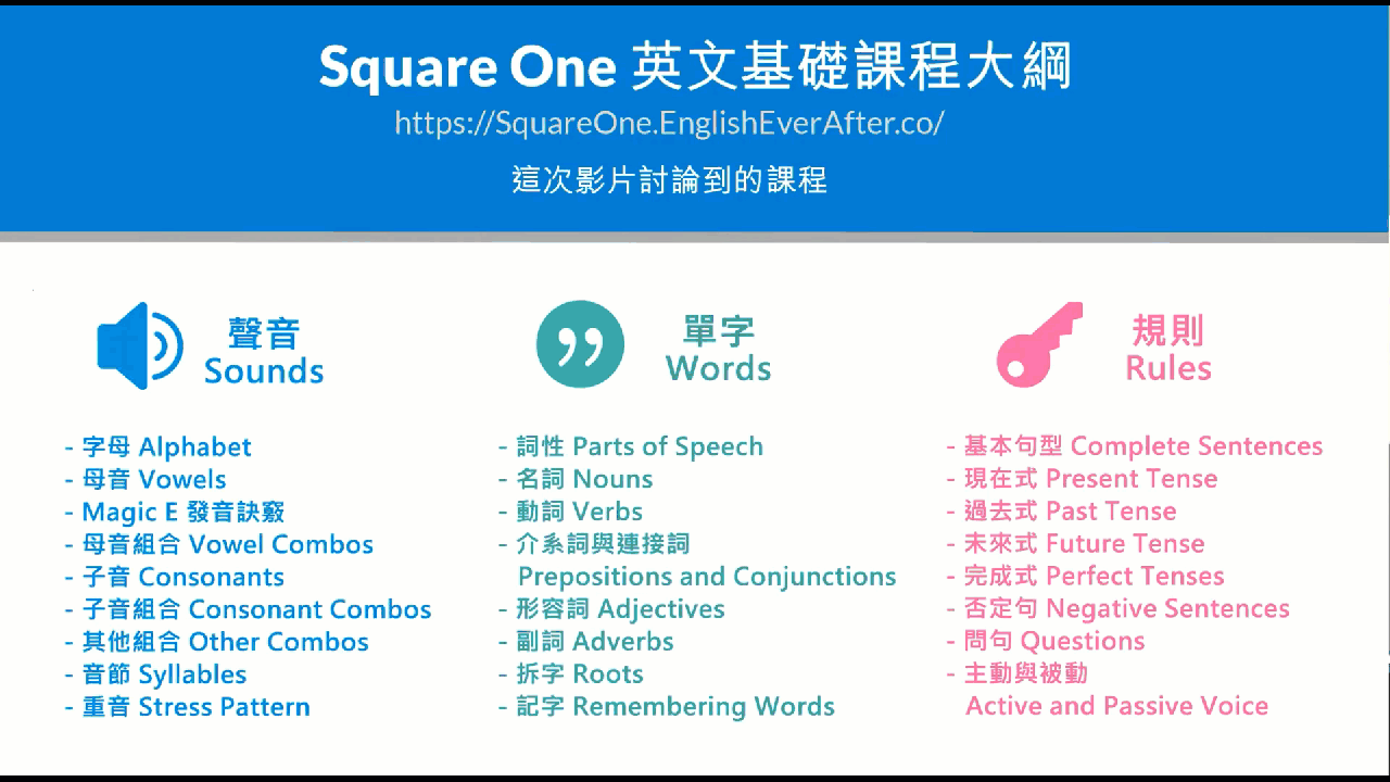 (影片 02:49~) 從這個例子我們知道詞性的重要性,如果想重新打好英文基礎,如同我的 Square One 英文基礎課程的安排:應該從「聲音 Sounds」的學習開始,接者進入「單字 Words」的理解,最後學習「規則 Rules」的使用。