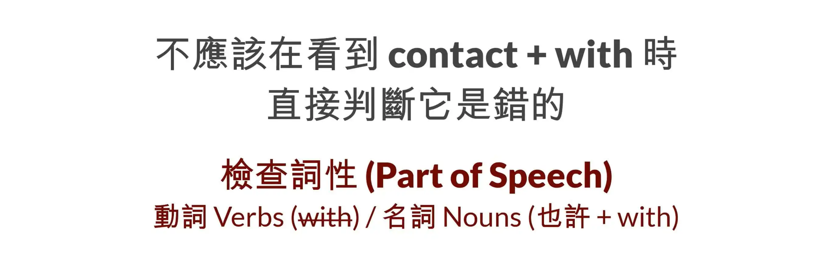 英文使用與學習的過程中,如果有留意「詞性」Parts of Speech 的習慣,能大幅減少文法的錯誤。今天的例子中,除了要注意 contact 的詞性是動詞外,也要特別留意動詞的小細節:「及物動詞」與「不及物動詞」(影片 01:04~) 。
