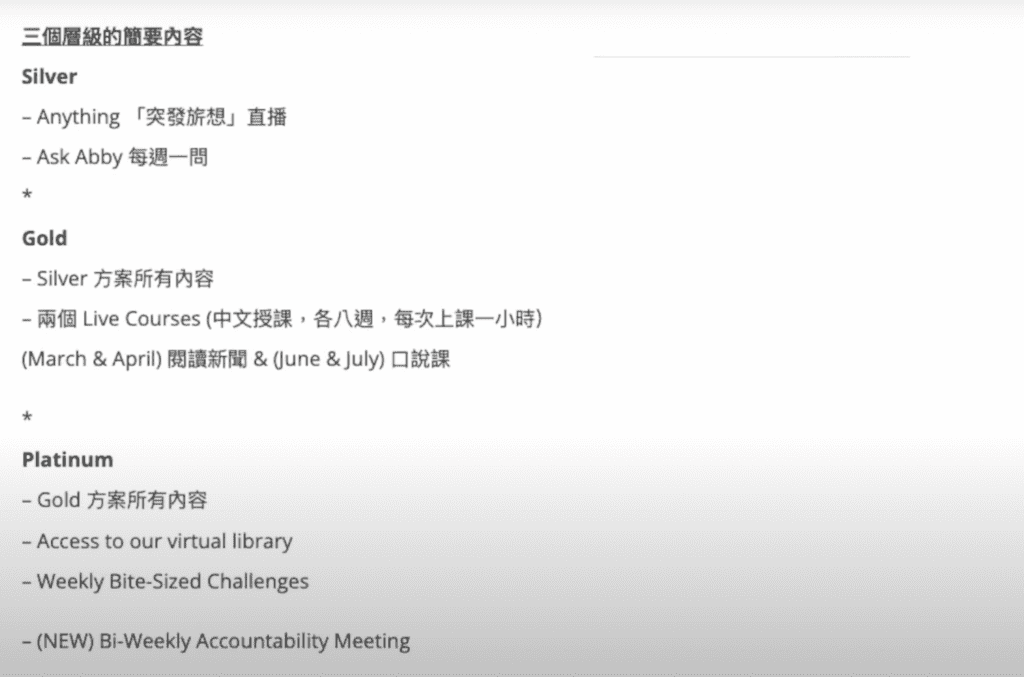 我實踐理念的作法可以在我的中高階英文私熟 English Ever After 看到,我將它分為三個部份,從簡單的 Silver 層級,有一些挑戰的,慢慢進入最多挑戰的 Platinum 層級。