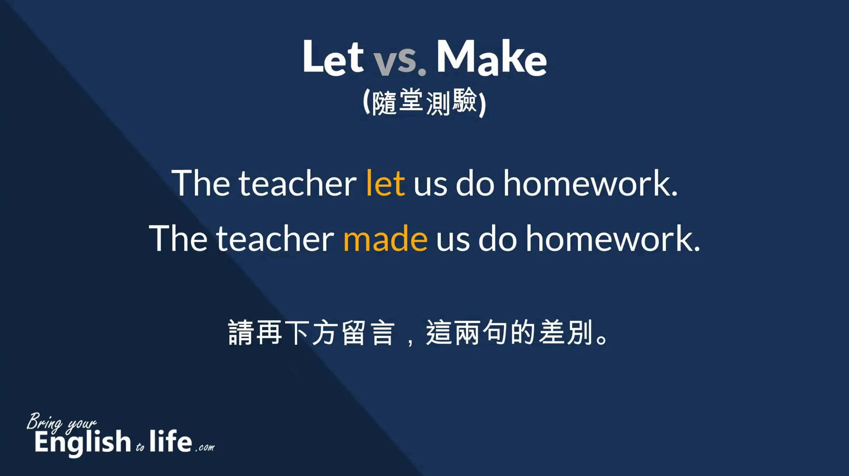相信現在應該已經清楚 “let” vs. “make” 的差別了,歡迎到我的 Youtube 影片下留言,告訴我這兩個例句的差別。