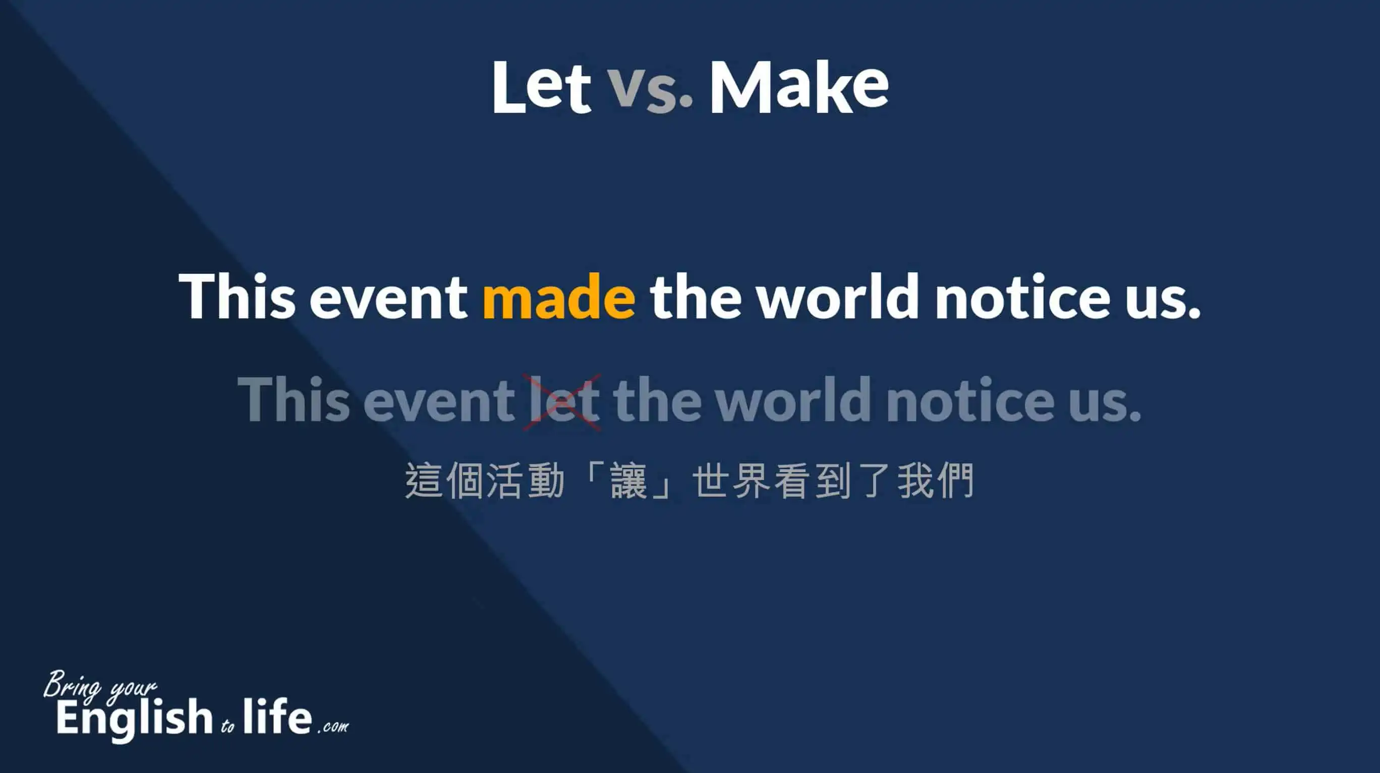 雖然在中文我們確實可以這樣說:『這個活動『讓』世界看到了我們』。但是在使用英文時,如果我們使用 “let” 這個字,就是在強調「給予准許」這個動作;而這個例句的意思,並不是表達,事件「允許」世界看到我們,而是,這個活動「迫使」世界注意我們。
