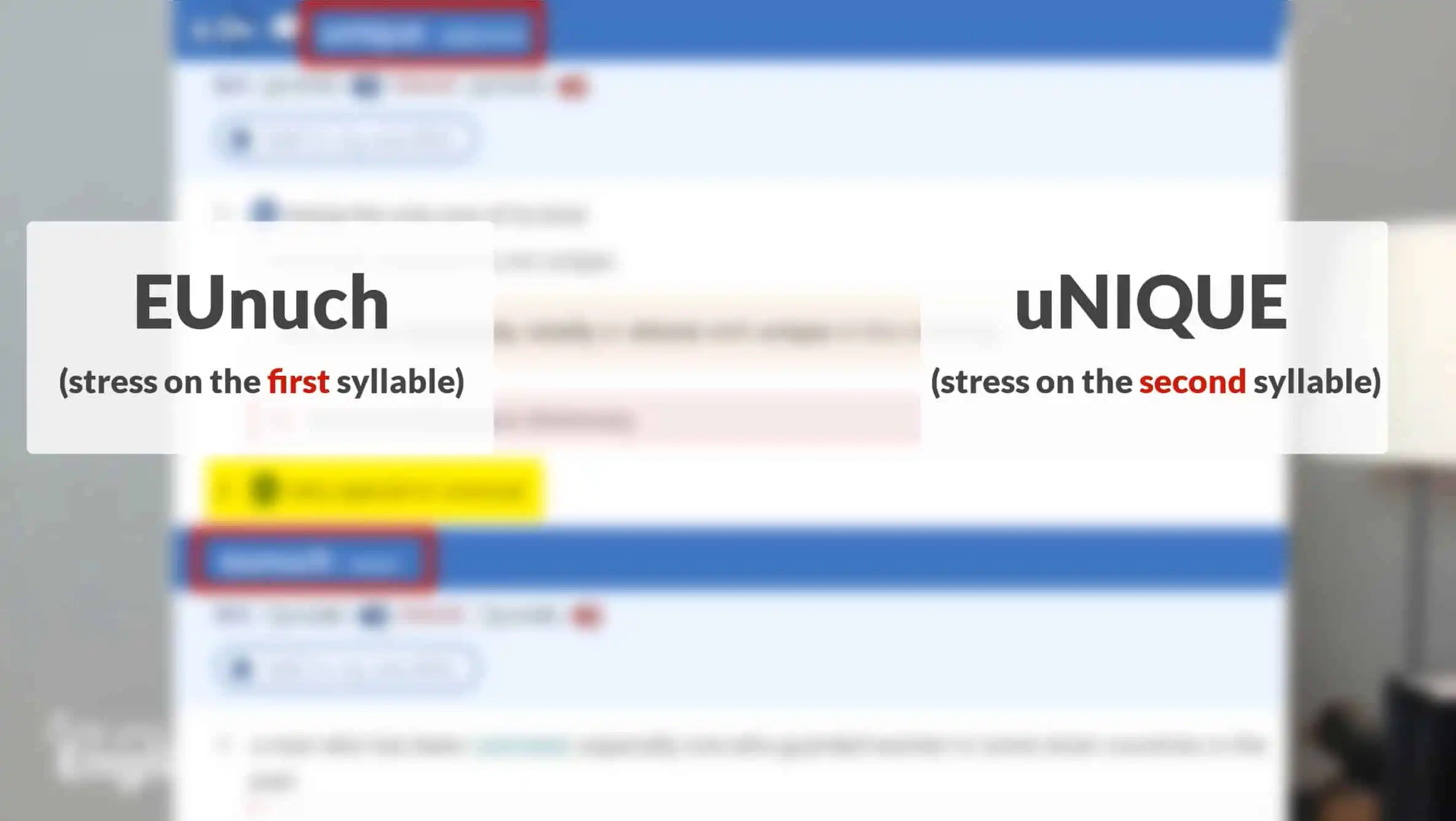 重音位置的不同 (第一或二第音節) 影響 unique 這個字的發音,若將 unique 重音錯放在第一音節發音,很可能被誤解為 eunuch。值得討論的是,這樣的重音錯位,不只容易發生在中文為母音的學習者身上(在我多年的教學裡,我聽過不少次),很多歐洲人也容易有這樣的發音差誤。這位在 Youtube上錯將 unique 唸成 eunuch 的解說者,聽起來就有法國口音。