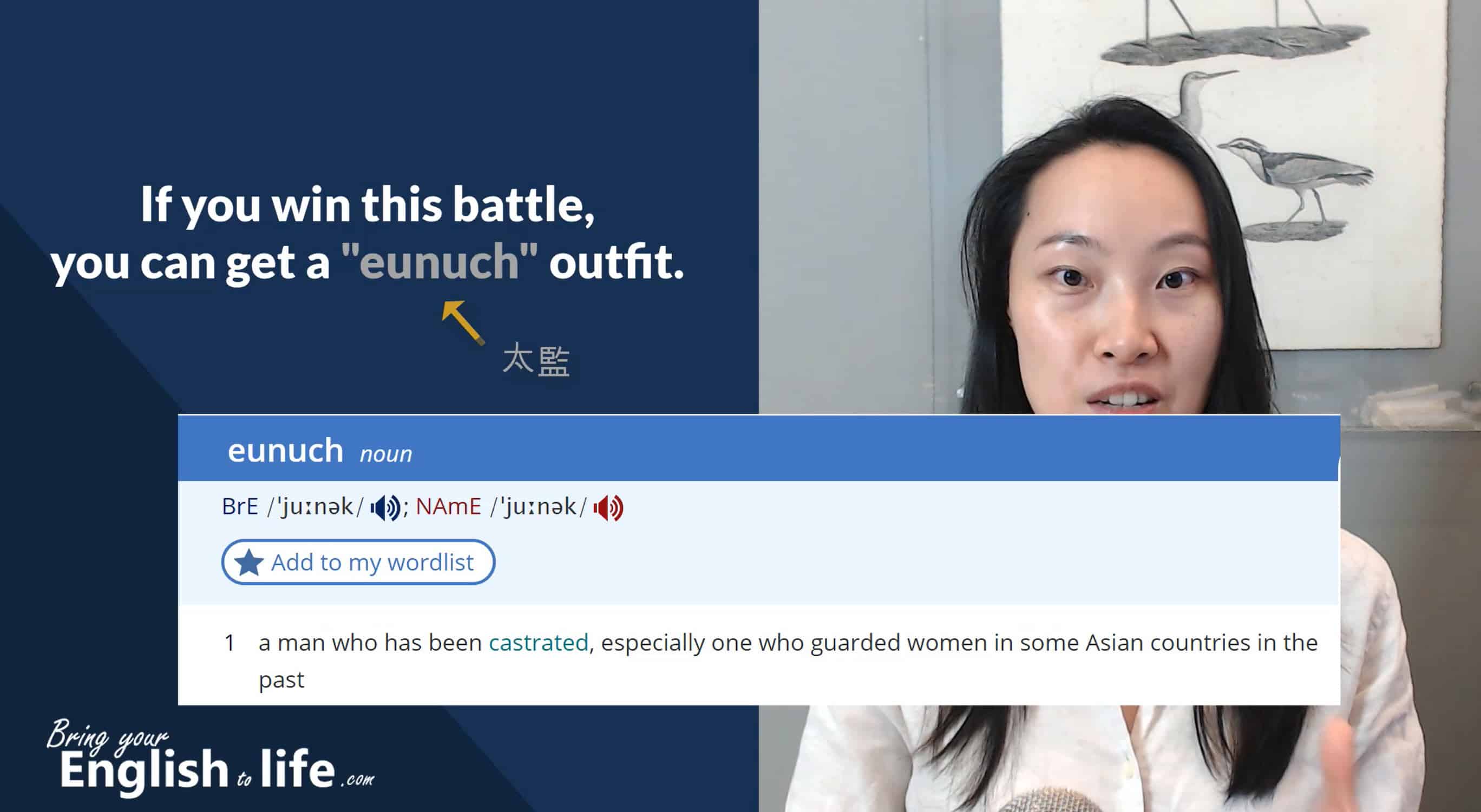 因為重音位置唸法的不同,很容易發音像「太監」的英文 eunuch。