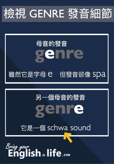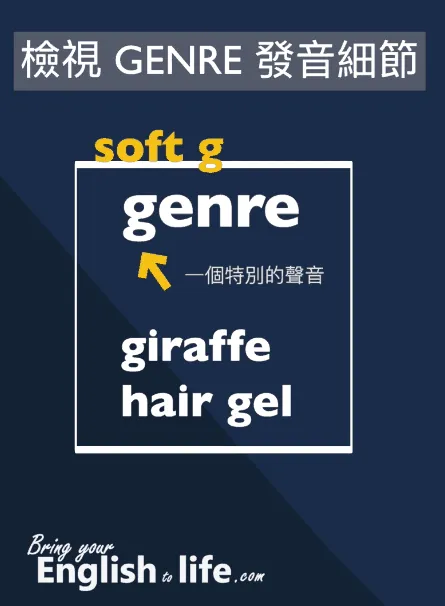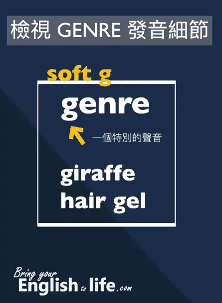 因為 genre 開頭 g 的聲音是來自法語的發音方式,它不是在英文中常見的發音方式;所以大家盡力就好,如果覺得太過困難,不需要氣餒,可以暫時以 soft g 的聲音取代。