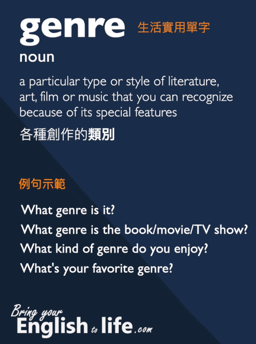 當看到一個新的創作,想要知道它是什麼「類型」,或是在英文聊天中,想再更深入知道對方喜歡什麼類別的電影、歌曲或文學 (影片 00:31~)。