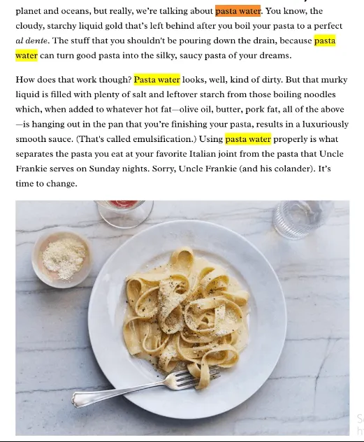 這個截圖來自於知名美食雜誌 Bon Appetit 的網站,文章標題是 “Pasta Water is Liquid Gold, Here’s How to Use It”,清楚說明煮麵水在烹調裡的重要性,它如同液體黃金一般珍貴。