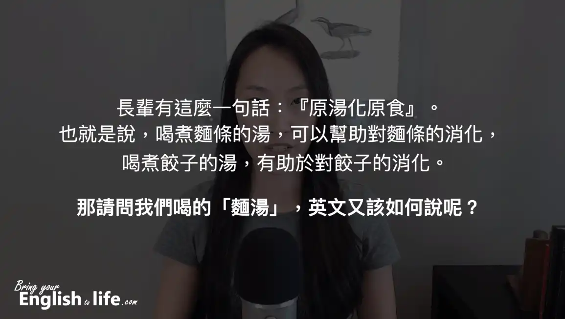 長輩有這麼一句話:「原湯化原食」。也就是說,喝煮麵條的湯 ,可以幫助對麵條的消化,喝煮餃子的湯,有助於對餃子的消化。那請問我們喝的「麵湯」英文又該如何說呢?