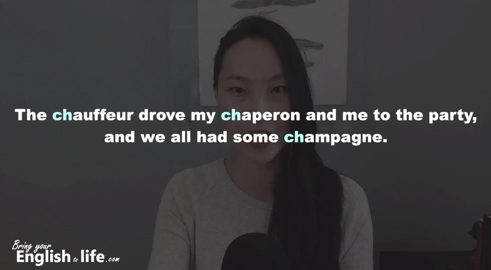 (影片 01:03~) chauffeur 司機 / chaperon 陪伴者 / champagne 香繽
