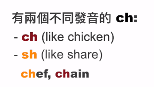 (影片 04:28~) 單字例子 (ch 發音為 sh)