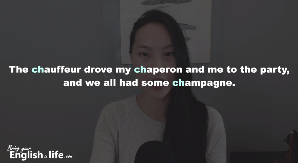 (影片 01:03~) chauffeur 司機 / chaperon 陪伴者 / champagne 香繽