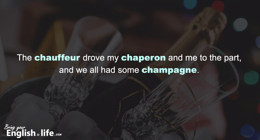(影片 01:03~) chauffeur 司機 / chaperon 陪伴者 / champagne 香繽