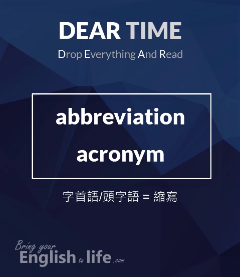 而 DEAR (Drop Everything And Read) Time 則是個自創縮寫,雖然不如前者普遍,但透過解釋後同樣變得實用。