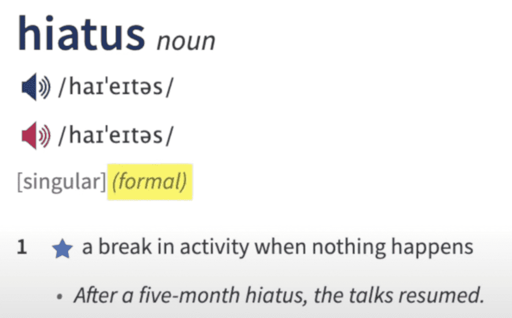 這段文字中有一個亮眼的字 – hiatus,就是我們今天要討論英文單字。它在 Oxford Learner’s Dictionaries 裡面的定義:a break in activity when nothing happens,大家可以看到它被標示為正式的單字。確實在新聞裡比較常看到這個單字的使用。