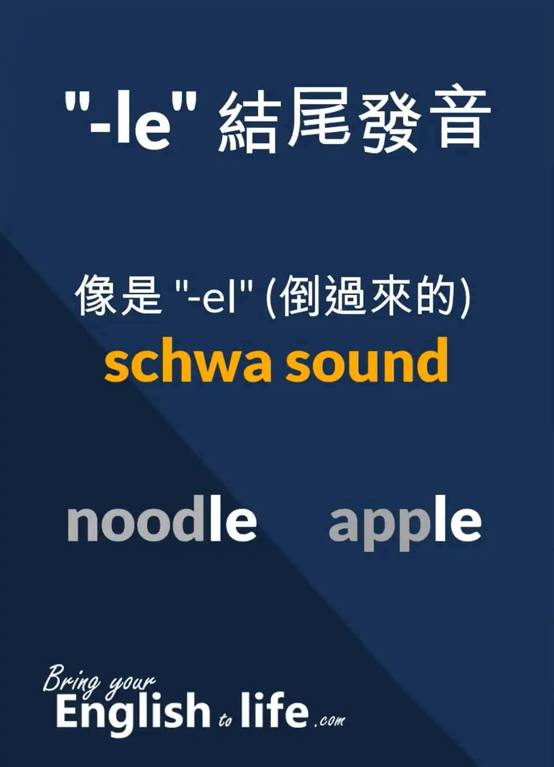 (影片 04:43~) 每一次看到 -le 字尾發音時,就要把它當成倒過來的 -el 發音,也請大家注意,這一個母音 E 是發成 schwa sound ,結尾則是我們所看到的 L 發音。
