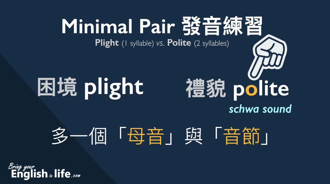 是不是也注意到 polite 相較 plight 多了一個母音,這也表示,它多了一個音節,這一個多出來的 o 發出的是一個 schwa sound,因為它的重音不是落在這一個音節上,請聽影片 02:22 的發音。