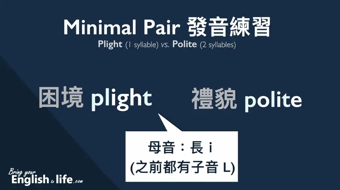 即然 plight 和 polite 發音這麼的相似,讓我們來分析它們的差異 (影片 01:51~):