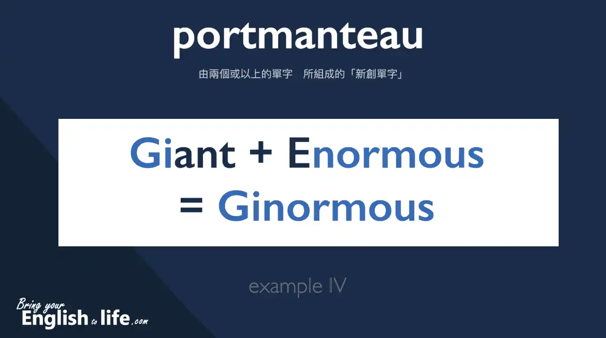 ๆๅพไธๅ portmanteau ็ๅฎๅญ๏ผไธๅ็ธ่ผไธๆญฃๅผ็ๅฎ่ฉ๏ผไธๅปบ่ญฐไฝฟ็จๆผ่ผๆญฃๅผ็ๅฏซไฝไธญใ็ถๆๅ่ฆ่ชชไธๅๆฑ่ฅฟๅพๅทจๅคงๆ๏ผๅฏไปฅ็จ ginormous ไพๅฝขๅฎนๅฎ (ๅฝฑ็ 03:01~)ใ