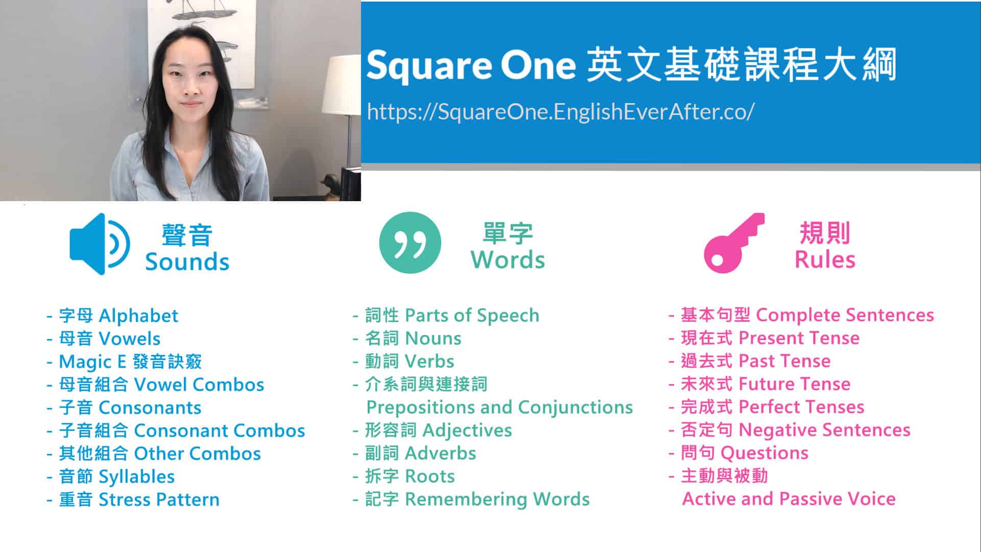 【聲音 Sounds】系列從字母開始,建立英文發音,接著的【單字 Words】系列,我們一起理解不同詞性在英文中的作用,最後【規則 Rules】系列,建立英文文法規則,開始練習英文的使用方法,熟悉建立英文句子。