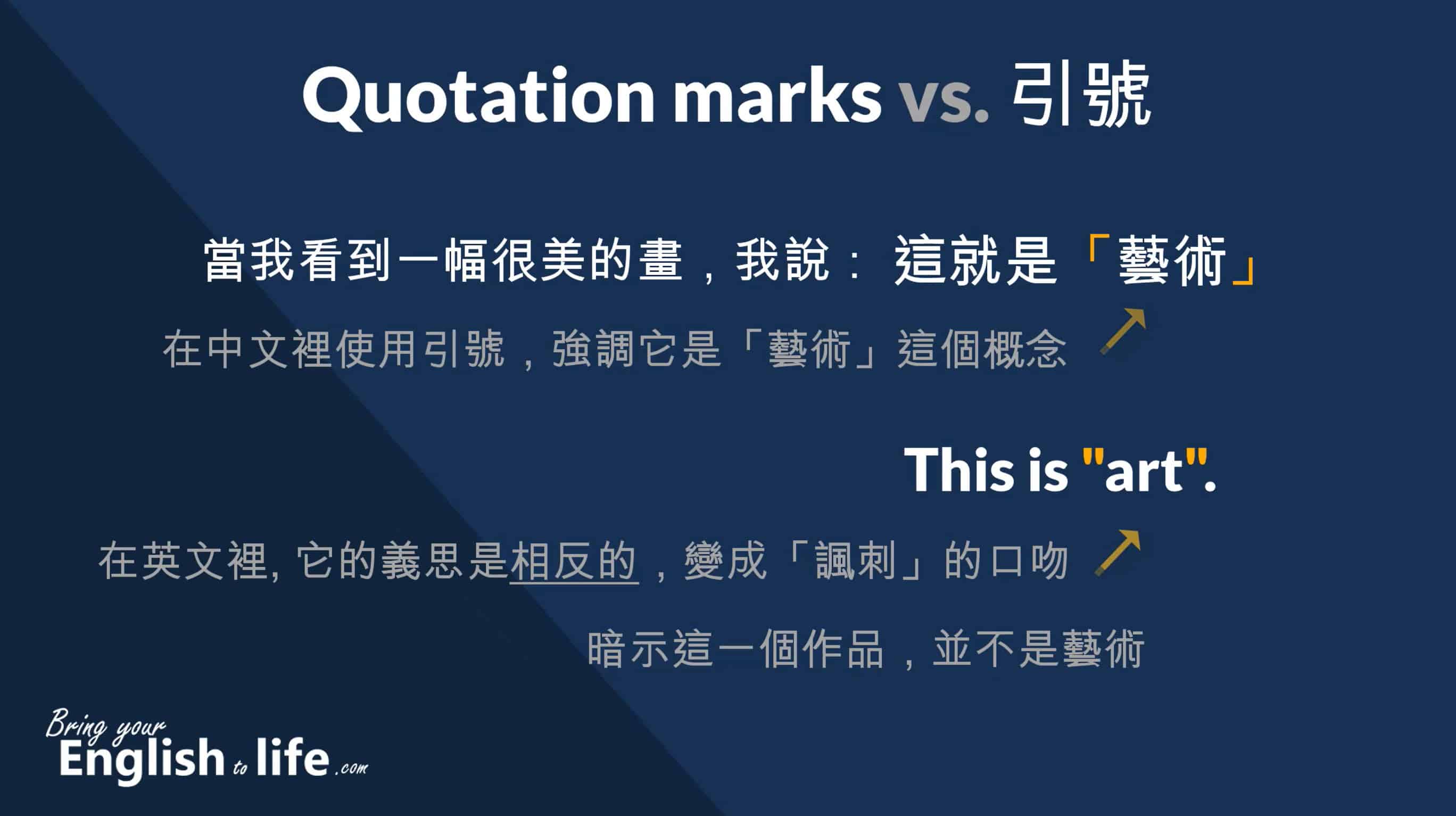 雖然兩個符號有這麼大的不同,但正因為英文的 Quotation marks 的對應就是中文標點符號的「引號」,所以常常會看到中文為母語的學習者,誤將中文引號 「」的使用方式,直接如法炮製的用於英文的 Quotation marks 。雖然在「引述」上,它們是同樣的,但是在其它的應用方面,它們卻各自有著極端不同的,如果直接將中文引號的規則,呆板的套用於英文的 Quotation marks 寫作應用,很容易有意思與語氣上的誤解。相信我們一點也不想,將一個本來被「強調」的概念,變成「反諷」的語氣。