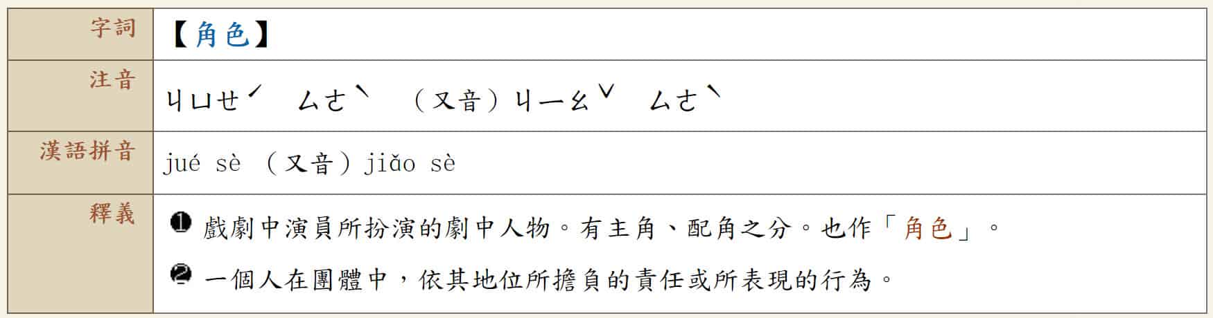 在英文中,這個字可以被翻成 “Role” 和 “Character”,而「角色」的中文,根據教育部的國語字典,有兩個意思。