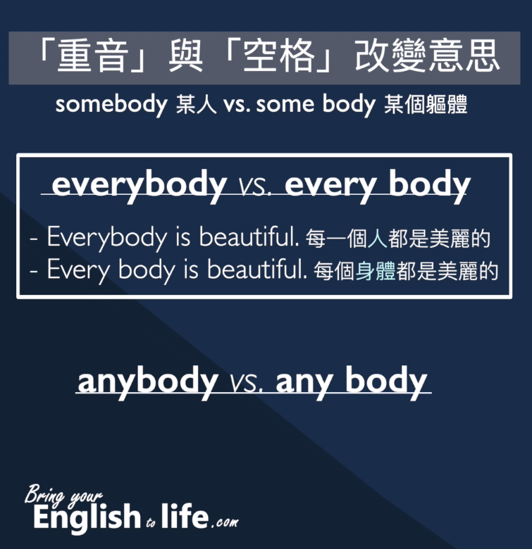 希望正在閱讀的你,能夠聽到「重音」是落在不同的位置,一個在第一個音節 somebody,而 some body 則落在第二個音 bo-。