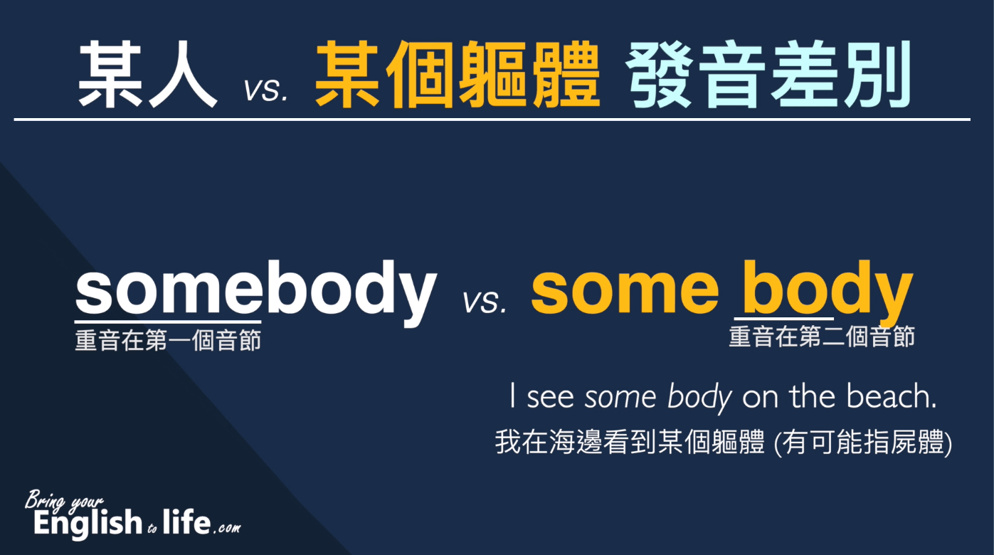 在這十年的教學經驗中,常觀察到英文「重音」錯亂所引起的大誤會。舉例來說, somebody 與 some body 重音落在不同位置,意思也不相同;之前討論過的「小空格大學問」除了書寫字面上的差異,口說發音也可能會不同,就今天的例子:「某人」與「某軀體」後者有可能指屍體,應該沒有人想有這樣的口語誤會吧!