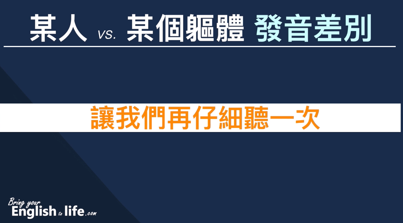 我發現許多人將 somebody 發音成 some body (影片 01:46~),若不是要表達後者,聽起來有點可怕。一個小小的「重音」能夠使兩個聽起來似乎一樣的英文詞,意思上有很大的不同。
