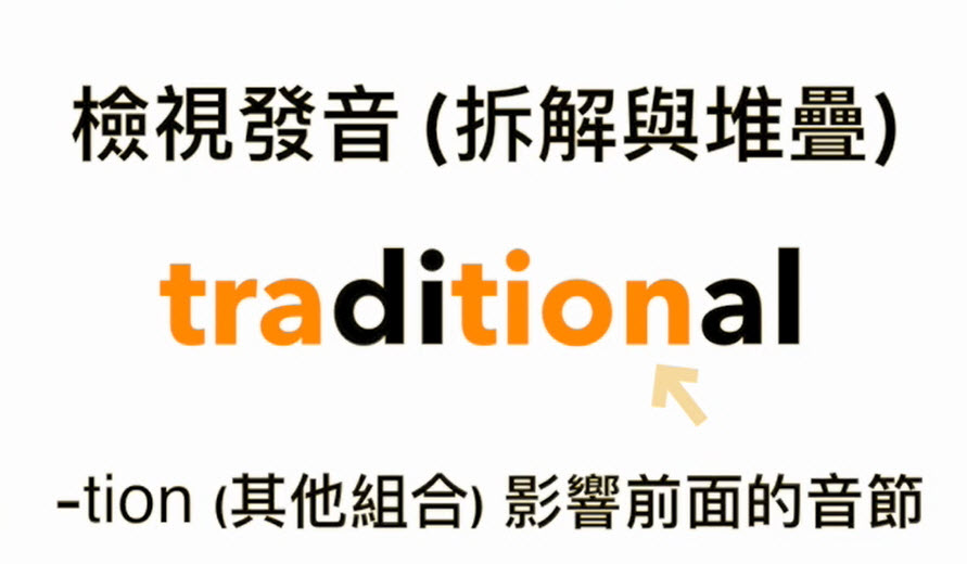 如果不太確定自己是否唸對 traditional 這個單字的發音 (影片 02:31~),像是,第一音節是不是多出一個 n 的聲音、 ch 與 tr 的音是不是有混淆,建議利用錄音的方式來仔細檢查。