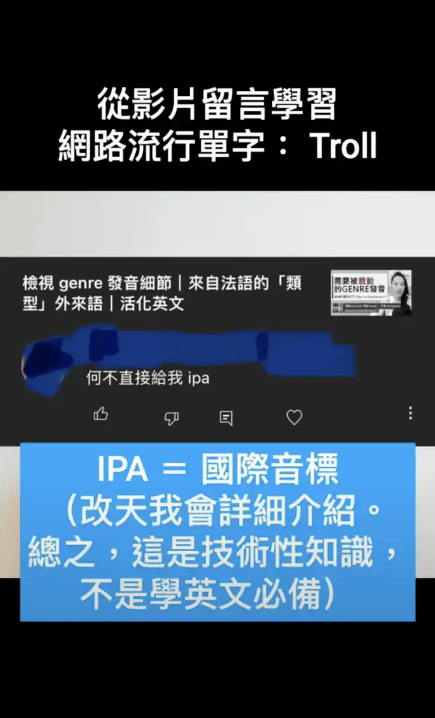 在我一個教發音的影片下有一位「酸民」(Troll) 留言問我:「何不直接給我 IPA」。