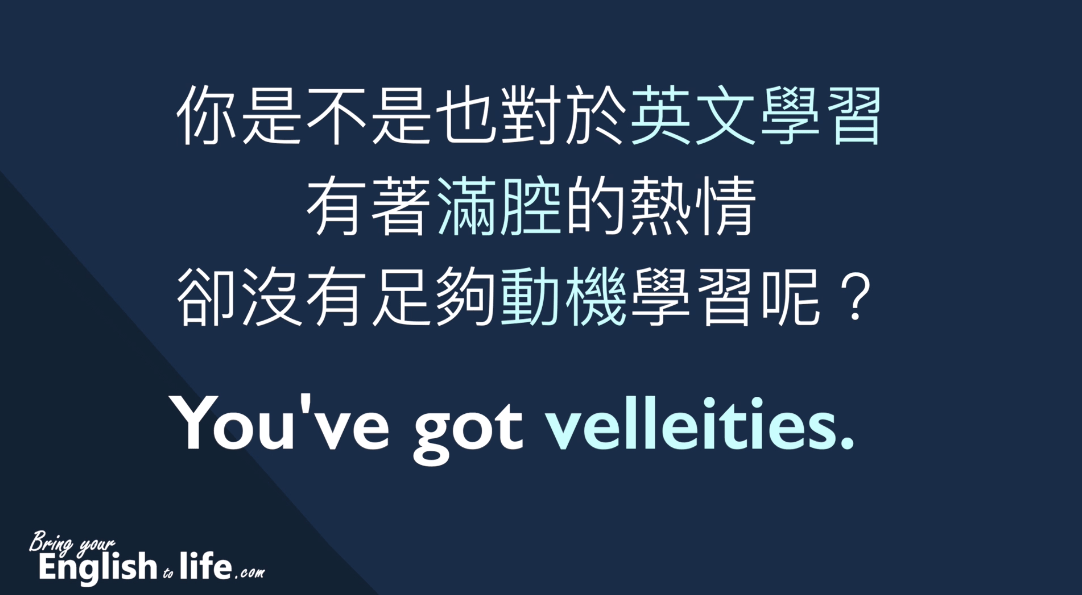 現在不妨試著用心感受,對於英文的學習的動機和實際行動,是不是位於同等的位置呢?並靜下心檢視自己:「你是不是對於英文學習有著滿腔的熱情,卻沒有足夠動機學習呢?」如果是這樣:You’ve got velleities!
