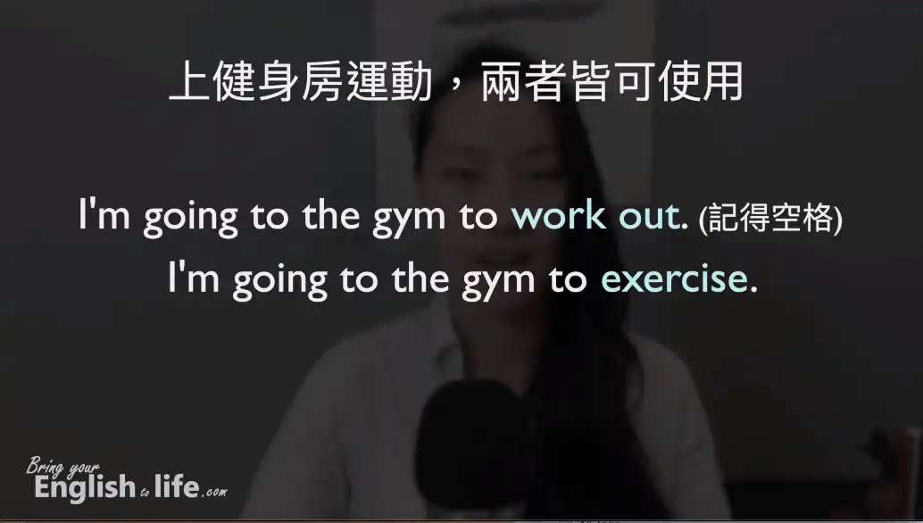 如果上健身房運動 (影片 00:53),我們會說:「我要去健身房運動」。若使用英文表達上述的意思,兩者 (work out/exercise) 皆可以被使用:
