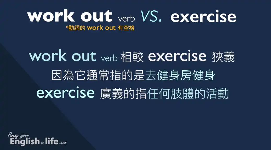 當 work out 中間有空格時,它是一個動詞片語 (影片 00:31~)。當 work out 是動詞的時候,從解釋意思的角度來看,它相較 exercise 狹義,因為它通常指的是「去健身房健身」這樣的運動,而 exercise 則比較廣義的指「進行任何肢體的活動」。