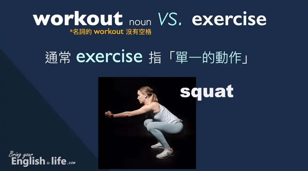 舉例來說,深蹲 (squat) 就是一個動作、是一個 exercise,而健身菜單或健身課表 (運動的流程) 裡面包含許多不同的 exercises (不同的動作是複數,要加 s )。